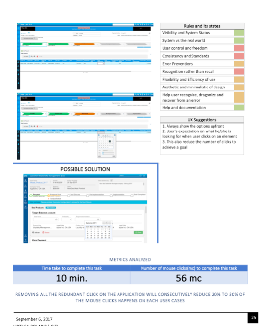 | Because there were too many questions to answer for each product, increase in number of human errors and the overall progress of a deal was hampered. | Conducted multiple sessions with product owners from across the region to consolidate questions on each product and collaborate with data analysts to vet out the historical trend of data flow, which aids in the development of a system that can prepopulate the majority of the questions on a product. |
